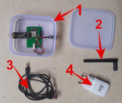The indoor unit is made up of three parts: a box (1), an antenna (2), a power cable (3), and a power supply (4). The power supply and cable may already be connected together.