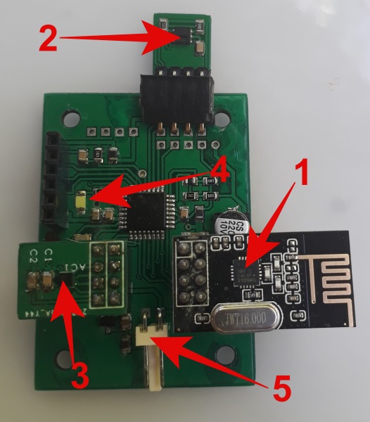 The sensor module has three other modules plugged into it: a radio (1), a temperature & humidity sensor (2) and a vibration sensor (3). It also has a white led (4) and a power connector (5).